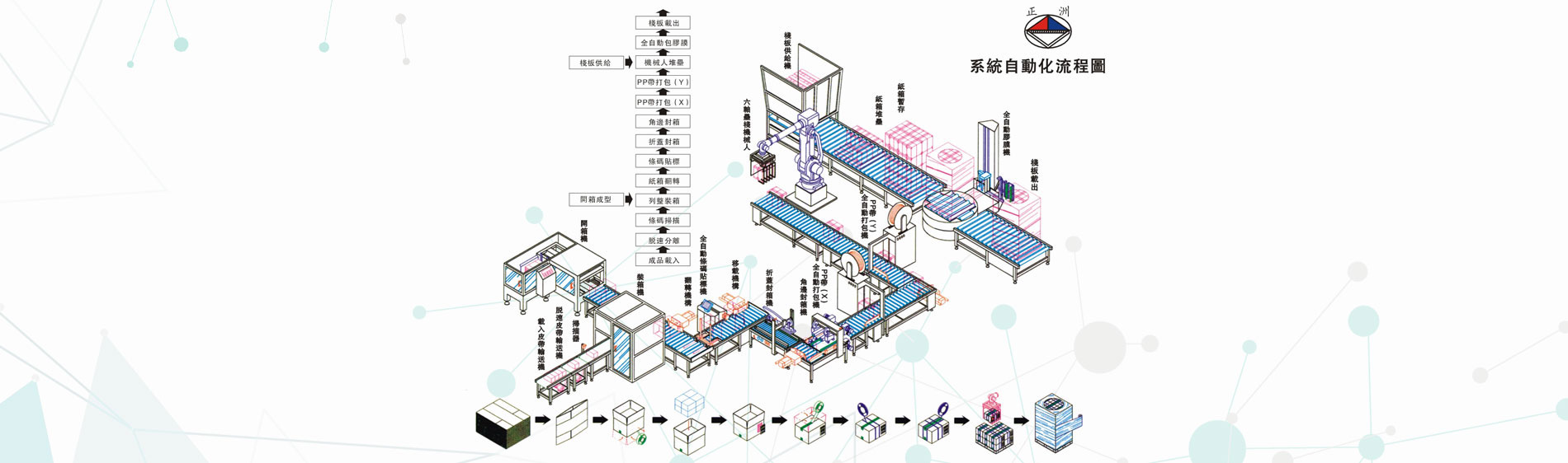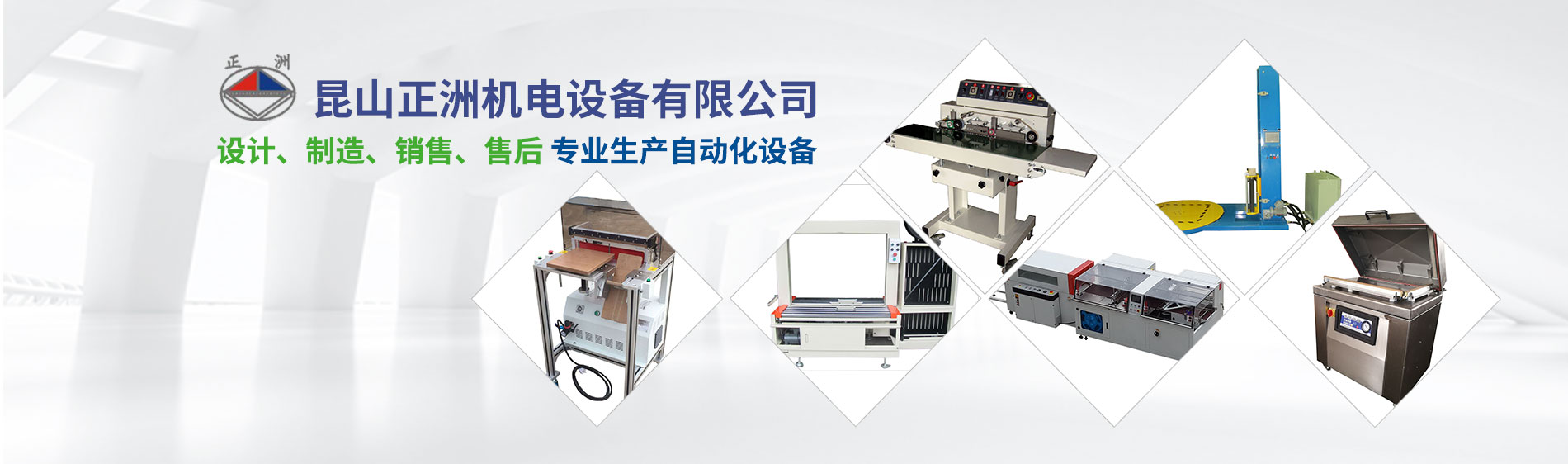 昆山正洲機電設備有限公司14年以來,堅持設計、制造、銷售、售后服務一條龍服務。生產(chǎn)經(jīng)營范圍迅速擴大,形成以下產(chǎn)品系列: 自動封箱系列;自動打帶系列;自動封口熱收縮系列;棧板自動包裝系列;抽真空包裝系列;省力真空搬運系列;流水線輸送系列;自動貼標/套標系列;熱熔膠自動噴膠/貼合系統(tǒng);進口手動打包工具系列;平面式裹包系列;自動倉儲系列;塑膠蓋自動封蓋系列等各種產(chǎn)品的無人化包裝系統(tǒng)的設計與制造。 公元1981年春,在莊志斌先生的帶領下,于桃園成立了一家專業(yè)生產(chǎn)自動化設備的工廠。主要生產(chǎn)后段包裝機械及PP打包帶,經(jīng)過20多年的苦心經(jīng)營已頗具規(guī)模,客戶達到3000多家。于2001年在廣東成立(東莞)工廠;2002年在江蘇成立昆山正洲機電設備有限公司(總部)。